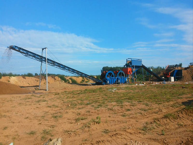 粗料進(jìn)入一臺反擊式制砂機內(nèi)進(jìn)行破碎;細(xì)料通過一條溜槽排入破碎機底部與破碎后的物料匯合,然后一起依次進(jìn)入兩臺輪式洗砂機內(nèi)進(jìn)行二次清洗,清洗后的成品料由成品料輸送機輸送至成品料區(qū)域;